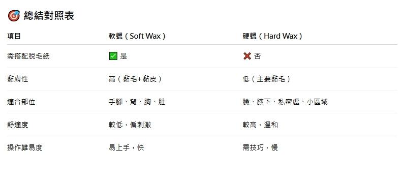 1. 依使用部位選擇 不同部位對蠟的柔軟度與黏性需求不同: 部位 建議蠟類型 特性說明 臉部 / 腋下 / 比基尼 硬蠟(Hard Wax) 黏毛不黏皮,溫和不刺激,適合敏感部位 手腳…